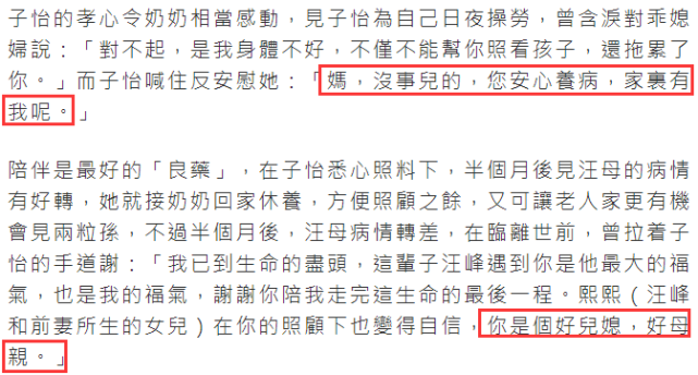 章子怡还安慰病重的婆婆,让她安心养病,称“家里有我呢”,而婆婆在去世前,还感谢章子怡为家庭的付出,称汪峰娶到章子怡是这辈子最大的福气,感谢章子怡对熙熙的照顾,称赞她是好儿媳、好母亲。