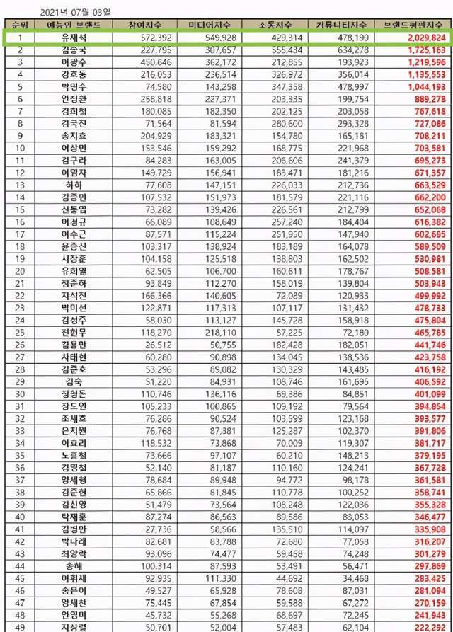这就是实力啊,刘在石金钟国李光洙包揽综艺人排行前三,经过对近三千万条大数据分析评判,最终认定,刘在石第一,金钟国第二,李光洙第三,后面分别是姜虎东、朴明秀!话说李光洙还想好好安心做演员,这下直接排到前三,光洙啊,有没有回来的想法,因为形象问题,想在韩国做到演艺人前三几乎不可能!