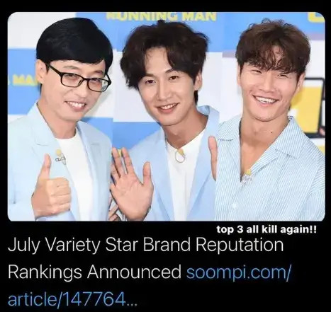 韩国本月第一周综艺人评价排行,Running Man成员包揽前三!