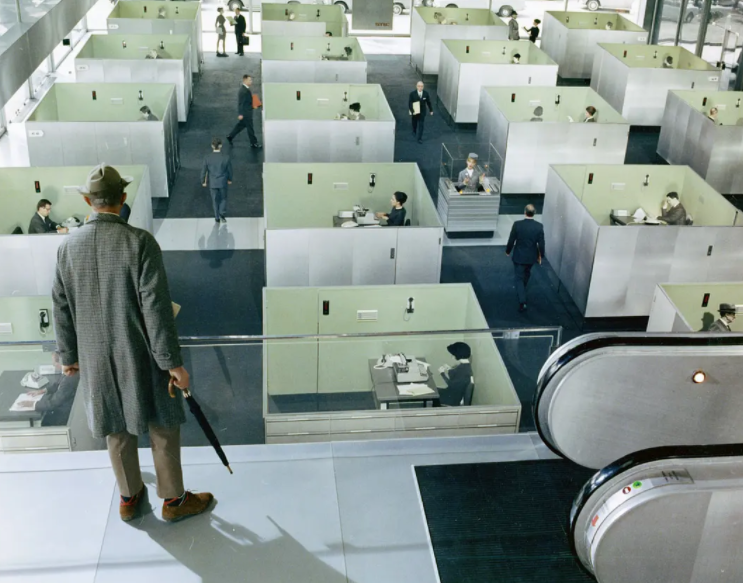 这就是现代化带给人们的困境,影片一开始,于勒在办公展区找人,即使是看见了自己要找的人,然而当于勒身处这个哪哪都相同的小隔间当中,他依旧是找不到想要找的人,这个小隔间就如同现代化之下的迷宫,看似可以带来个人独立的办公场所,实际上却隔开了每个人应该有的不一样的灵魂。