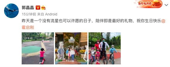 在个人媒体账号上面,郭晶晶罕见地向老公霍启刚说情话。郭晶晶发文:“昨天是一个没有流星也可以许愿的日子,陪伴即是最好的礼物,祝你生日快乐! ”