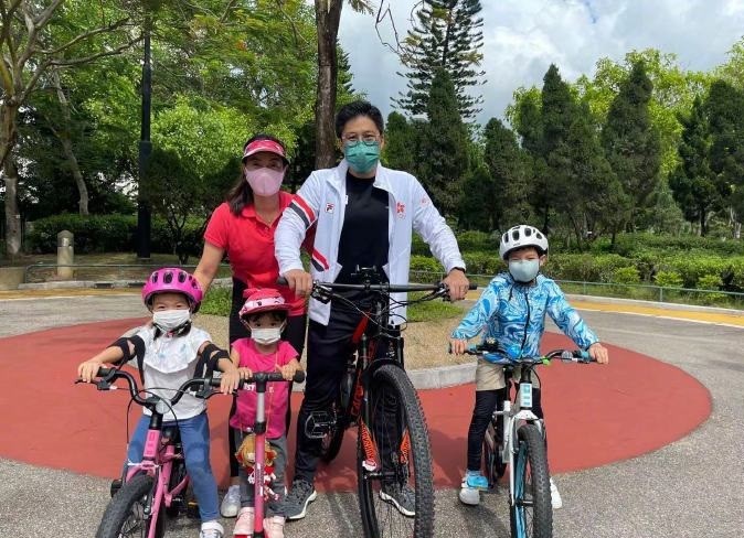 另外郭晶晶配上自己一家五口骑车的全家福,照片之中三个儿子站在最前面,老公骑着大自行车与郭晶晶一边一个,然后一家人在公园里面享受骑车了快乐。
