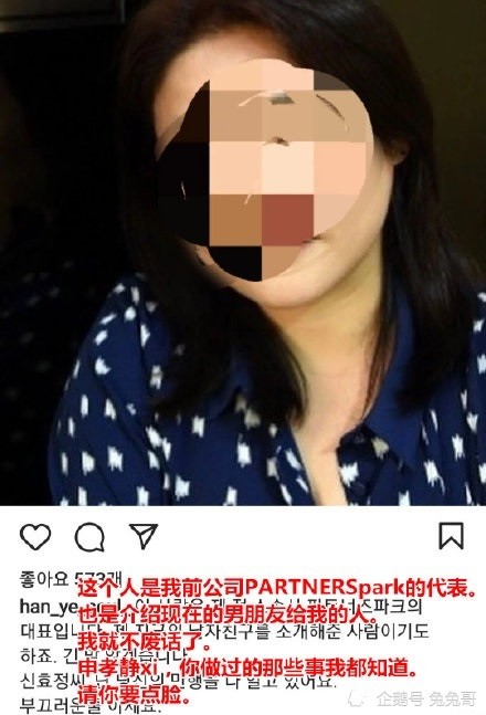 韩艺瑟在社交账号上发文“这是我前公司的代表,也是介绍我现在男朋友的人,我不废话了,申孝静,你做过的那些事我都知道,请你要点脸”。