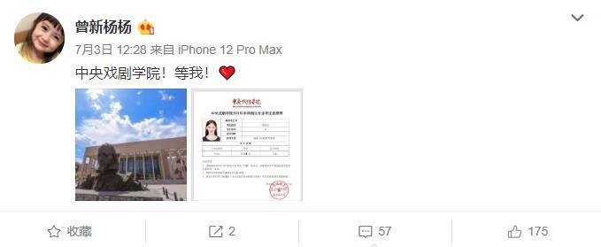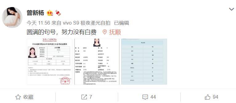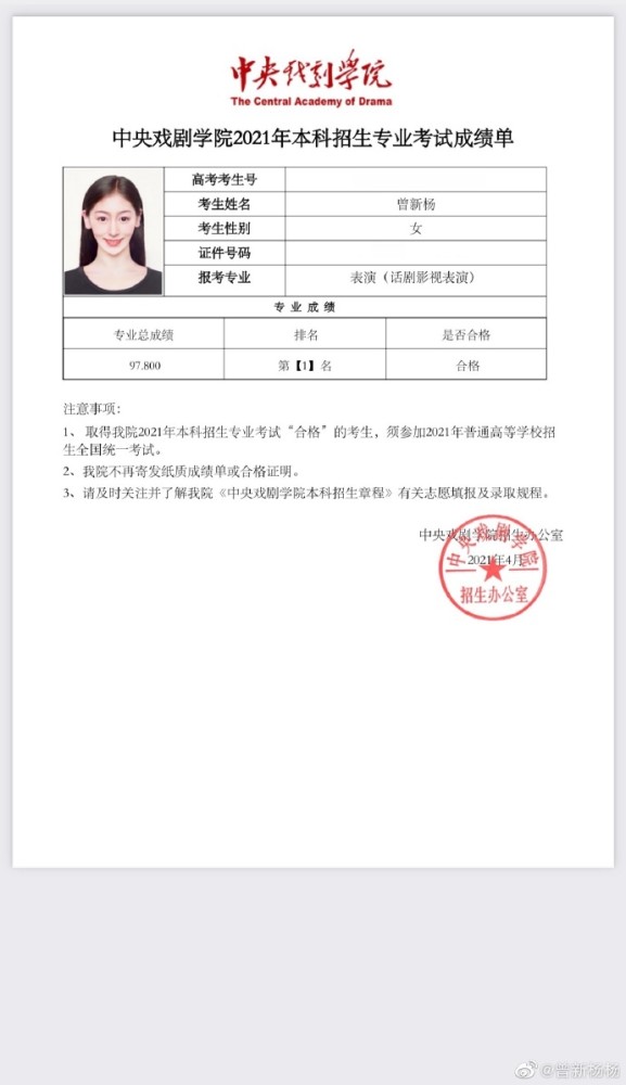 翻开曾新杨的博文,原来她已经正式官宣考上了中戏,并晒出中戏大门的图,以及她本人专业课的成绩单。曾新杨本人专业课话剧影视表演是第一名的成绩,这个是实打实的成绩,她本人并未晒出高考文化课成绩究竟是多少分。