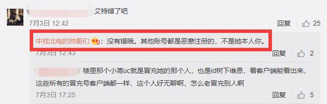 随后,该大V还在评论区回复网友:“其他账号都是恶意注册的,不是她本人”。