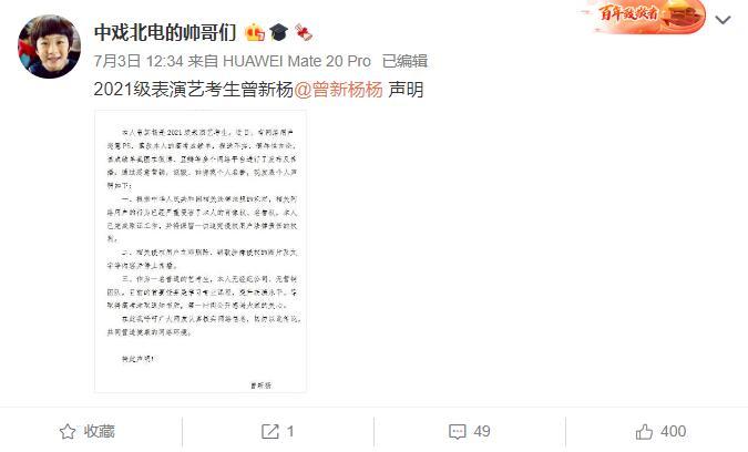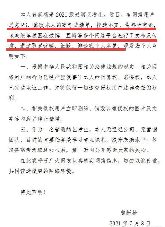 在声明中提到,本人曾新杨是2021届表演艺考生,有网络用户恶意PS,篡改本人的高考成绩单,捏造不实,侮辱性言论,被恶意营销,诋毁,诽谤个人荣誉等。