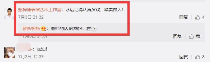 有一位曾新杨艺考老师嘱咐她说:“永远记得认真演戏,踏实做人”,曾新杨回复老师:“老师的话,时刻铭记在心”。