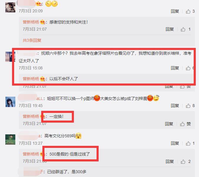 不仅如此,曾新杨本人在评论区回复了很多网友的质疑,有网友问:“高考文化分589吗”,她本人回复说:“500是假的,但是过线了”。也就是网上传言的589分确实是假的,但过线是真的,至于究竟多少分数,曾新杨并未分享。