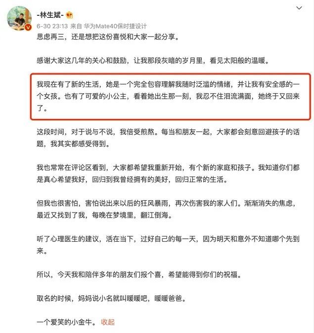 但这几年有持续在关注林生斌动态的网友,却觉得事情不太对劲。明明隔三差五还在微博缅怀妻子,一度想要皈依佛门,怎么转眼婚结了,孩子都有了。这和网友认知中林爸的形象好像完全割裂开了?