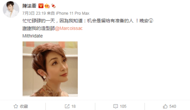 7月3日,陈法蓉微博晒出一张短发美照,她还艾特了自己的造型师,表示感谢。