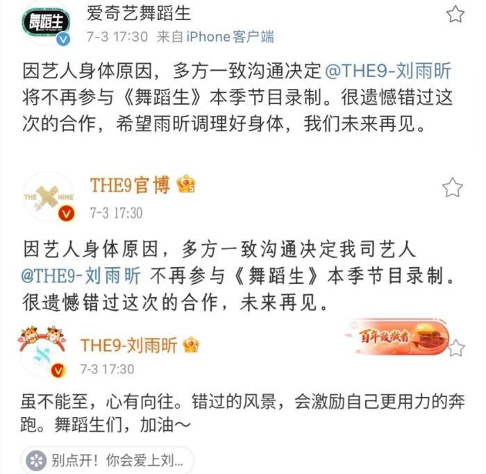 序言:2021年7月3日,综艺《舞蹈生》官微和女团THE9官微同时发布微博,表示刘雨昕因为身体原因,不参与《舞蹈生》的录制,很遗憾错过这次合作,希望未来再见。