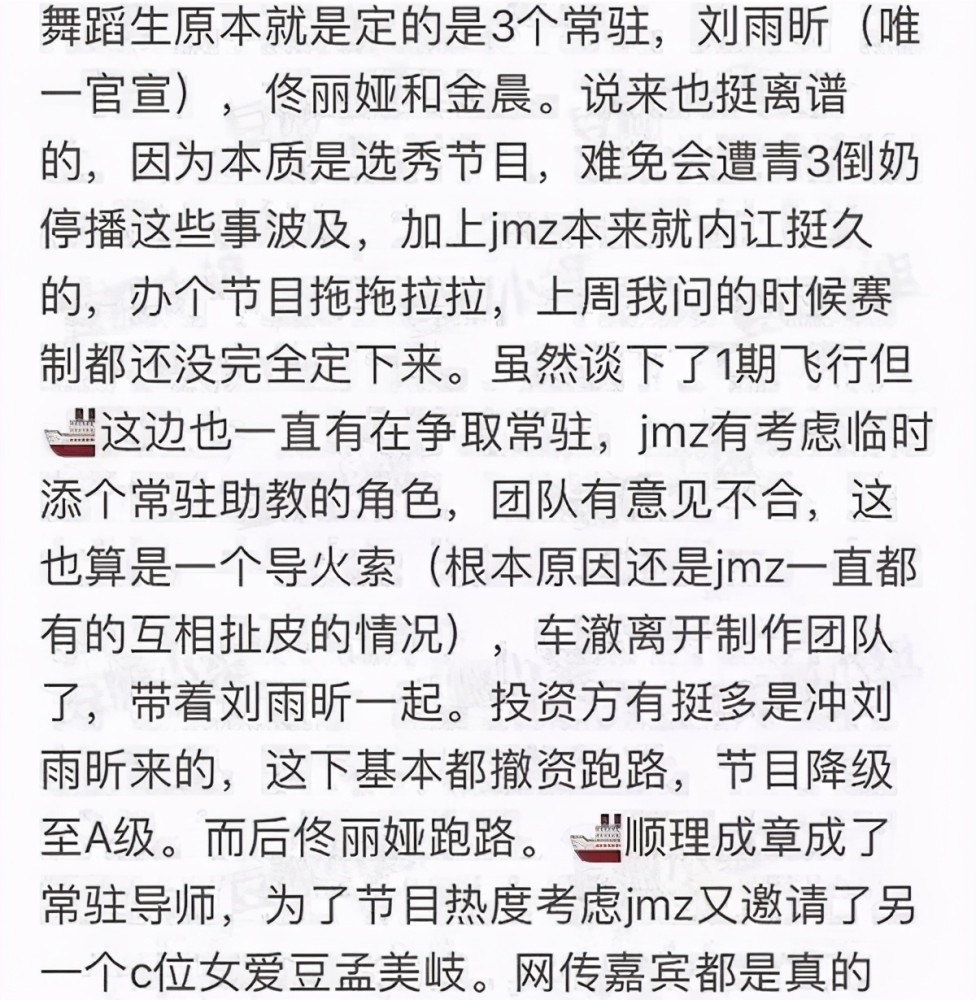 《舞蹈生》找来了孟美岐和罗一舟救场:《青春有你3》的罗一舟本来是助教,实在找不到人了,就让他接替佟丽娅成为导师,实力算是下降了。孟美岐是《创造101》的冠军,刘雨昕是《青春有你2》的冠军,孟美岐接替刘雨昕太完美。