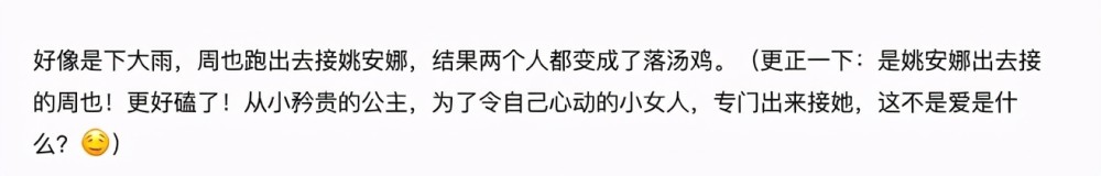 而且在《中餐厅》中,姚安娜也并没有所谓的名媛富二代的架子,有网友晒出姚安娜去冒雨接周也的路透图,称两人都被淋湿,但即便这样二人依旧紧密同行,cp感十足。