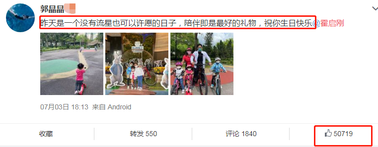 而郭晶晶配文表示,“昨天是一个没有流星也可以许愿的日子,陪伴是最好的礼物,祝你生日快乐”。郭晶晶和霍启刚之间,没有过多的情话,但一切都在不言中,就像郭晶晶所说,陪伴才是最好的礼物,霍启刚除了工作之外,将大部分时间都放在家庭上。