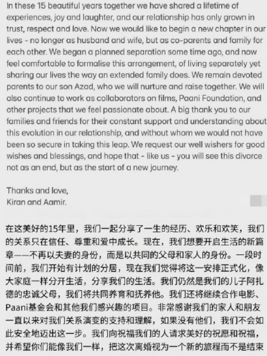 在离婚声明中指出,阿米尔汗与基兰的关系在“信任、尊重和爱中成长”,“现在想要开启生活的新篇章”,“不再以夫妻的身份,而是以共同的父母和家人的身份”,并表示两人将共同抚养儿子阿扎德,未来也将继续合作电影、基金会以及其他感兴趣的项目,并称“离婚是一个新的旅程而不是结束”。