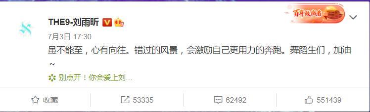 刘雨昕在宣布退出《舞蹈生》的时候,虽然是退出的宣言,但还有种“我想去,但我不能去。《舞蹈生》是我要砥砺前行的例子”的感觉。
