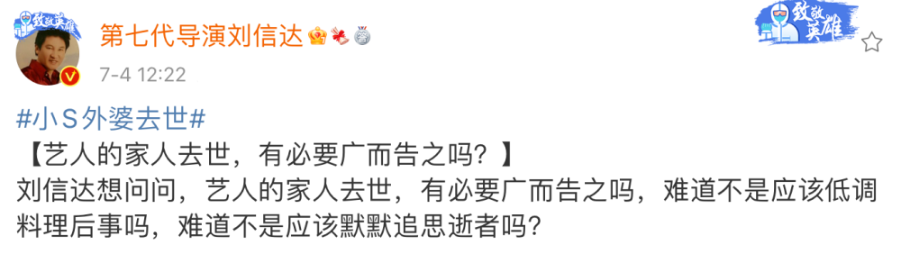 刘信达的发问绝对是灵魂拷问。小S外婆去世,这是她的家事,小S发文悼念也是出于本人对外婆真挚情感的表达,有错吗?