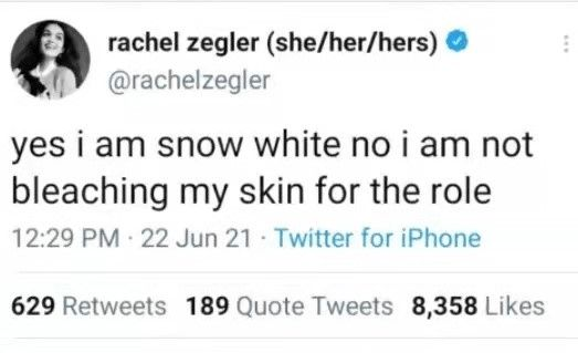 偏偏她自己引火上身,在推特表示自己不会为了角色改变肤色,“是的现在我要演白雪公主了,我不会为了角色而漂白皮肤的。”