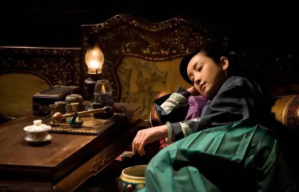 身处旧社会,她只能在夜深人静时卸下所有保护层,一个人倚靠在床榻上抽鸦片以此度过漫漫长夜,眼神迷离,每个镜头都让人难忘。