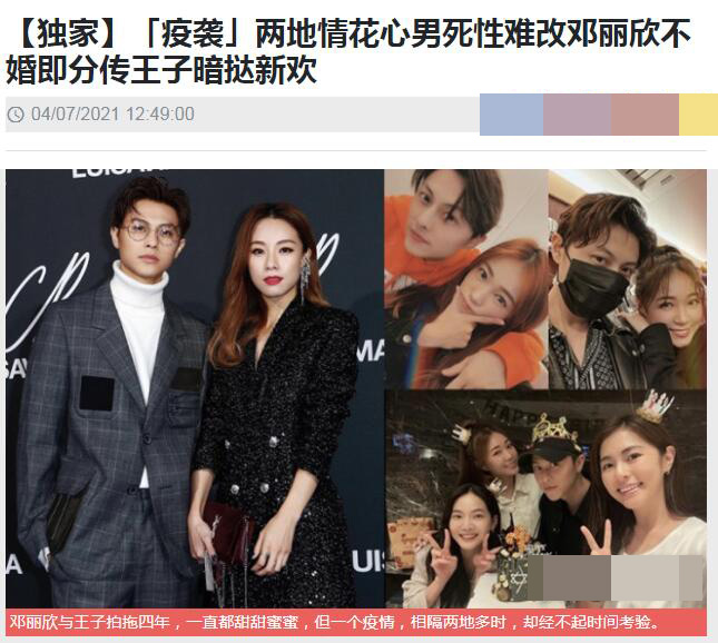 邓丽欣和王子的分手方式看似很平和,各自发文宣布结束感情,有传姐弟恋分开的原因,是疫情导致相隔两地,男方曾在5月份抵港陪伴,竟成为两人分手前最后一次见面。