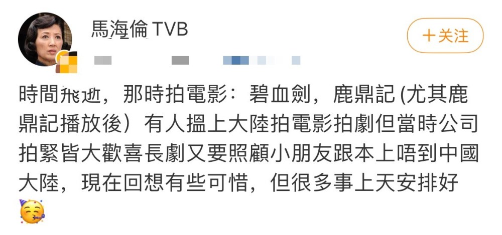 虽然鲜少在内地活动,但马海伦也时常挂念着内地。她在社交平台上发文感慨,治安时光飞逝,拍鹿鼎记的时光一去不复返,很多事情都是上天安排。