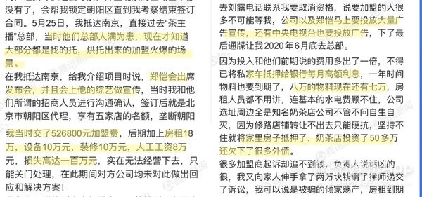 有网友称自己加盟郑恺代言的茶主播被骗了,