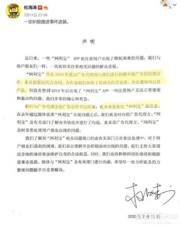 杜海涛方面则是表示从未代言过网利宝,