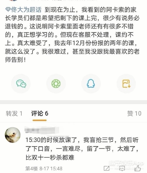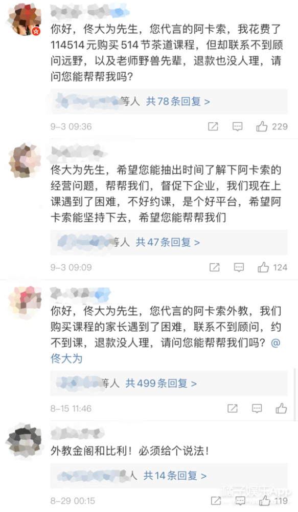 家长无法约课也无法申请退款,只能跑到代言人微博下边寻求帮助,