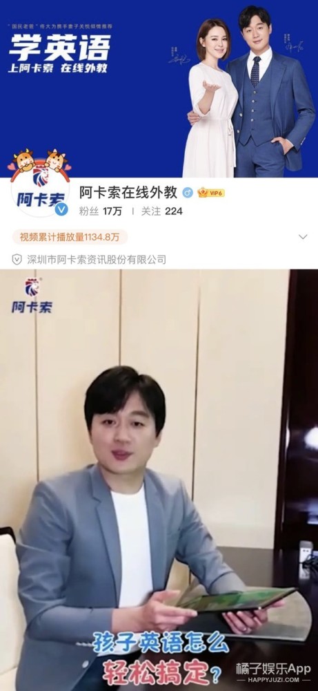 他和妻子关悦代言的英语培训机构阿卡索“双减”后疑似失联,