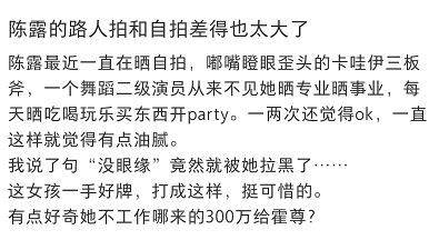 偷拍陈露的网友表示,她的生图和自拍对比相差太大,而且对她每天各种晒吃喝玩乐开party表示不满。还称自己不过说了一句“没眼缘”就遭到陈露拉黑,暗示她个性并没有大家看到的那么温柔可人。