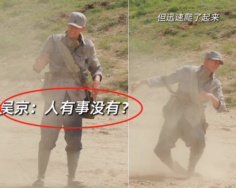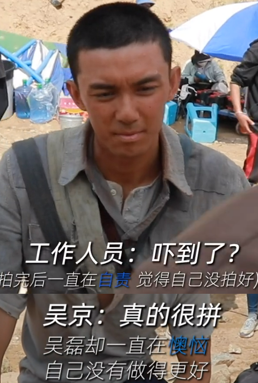 在导演吴京询问他身体情况时,他也只是拍了拍身上的泥土,摆了摆手示意,坚强敬业的工作态度让人不得不佩服。