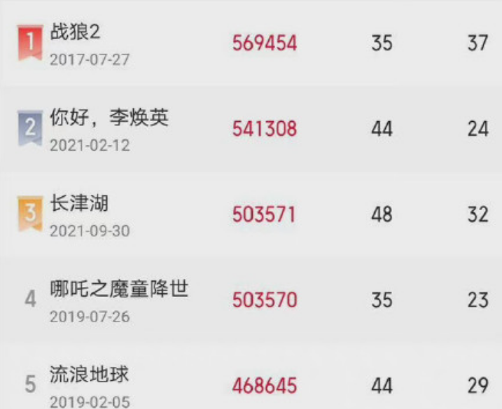 当然了,在众多的记录中,编者认为有一项记录不得不提,那就是破50亿的耗时。就在今天,《长津湖》以50.36亿的票房超越《哪吒之魔童降世》,成功跻身中国影史票房前三,而如果以当下《长津湖》的票房趋势做个推算,未来超越《战狼2》也不是不可能,毕竟现在《李焕英》的记录已经被破。