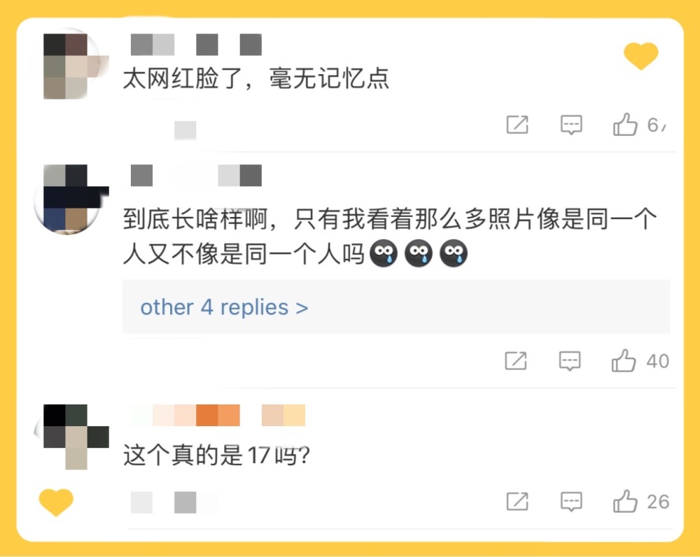 一些网友评论说看她的照片总会有种“网红”风的感觉,路人下的镜头和她平日社交帐号上的图片差别太大,被网友质疑是否整容了。还有人扒出了她以前发在社交帐号上的素颜照,娃娃头发型的大头照虽然说不上惊艳,但是给人是自然舒服的感觉。