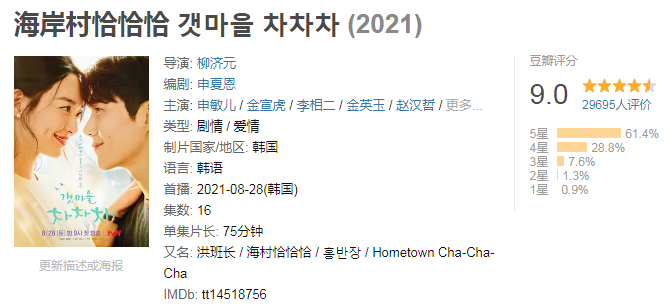 《海岸村恰恰恰》是一部高开高走的韩剧黑马,其豆瓣评分,从刚开播的8.6一路涨到9.1,后来虽稍有回落,但仍高达9分。