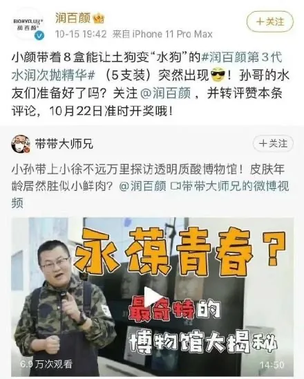 有网友指出,10月15日,也就是几天前,华熙生物旗下的某款产品邀请了一名网红“带带大师兄”,为他们的产品做推广,随后,他们转发了“带带大师兄”的视频。本来是想为“双十一”做一波预热的,却没想到,转发视频时所配的文案引起了争议。