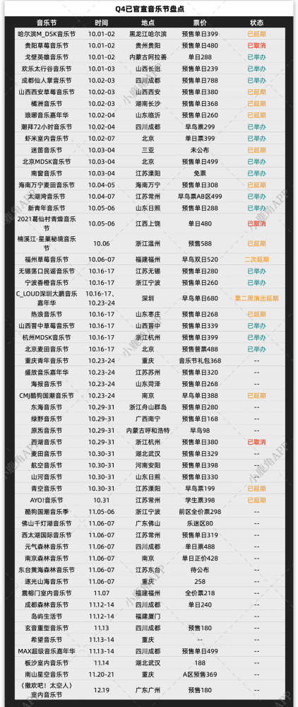 撇开疫情导致的延期,我们先来整体看看第四季度音乐节落地的情况。