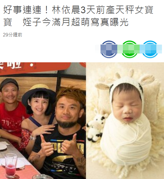 10月21日晚,台媒突然曝光一张小孩婴儿照,起初以为是林依晨的女儿,结果才发现是林依晨的小侄子。原来林依晨家里双喜临门,她的弟弟林维圣在9月21日喜得麟儿,至21日刚好满月,大方公开孩子的正面照。
