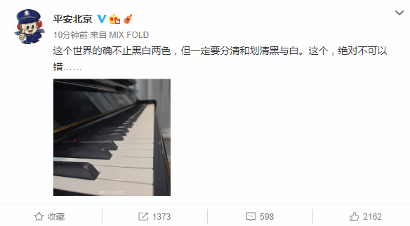在此之前,平安北京官微也发文写道:“这个世界不止黑白两色,但一定要分清和划清黑与白。这个,绝对不可以错”,并且还附上了一张黑白钢琴键的照片,颇为讽刺。