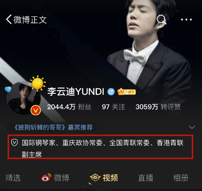 李云迪在参加《披荆斩棘的哥哥》前就已经算得上是家喻户晓的钢琴家,在钢琴事业上他获得的荣誉数不胜数。而翻看他的V博认证:国际钢琴家、重庆政协常委、全国青联常委、香港青联副主席,是不是个个称呼都是响当当!然而现在看上去,却是满满的讽刺了。