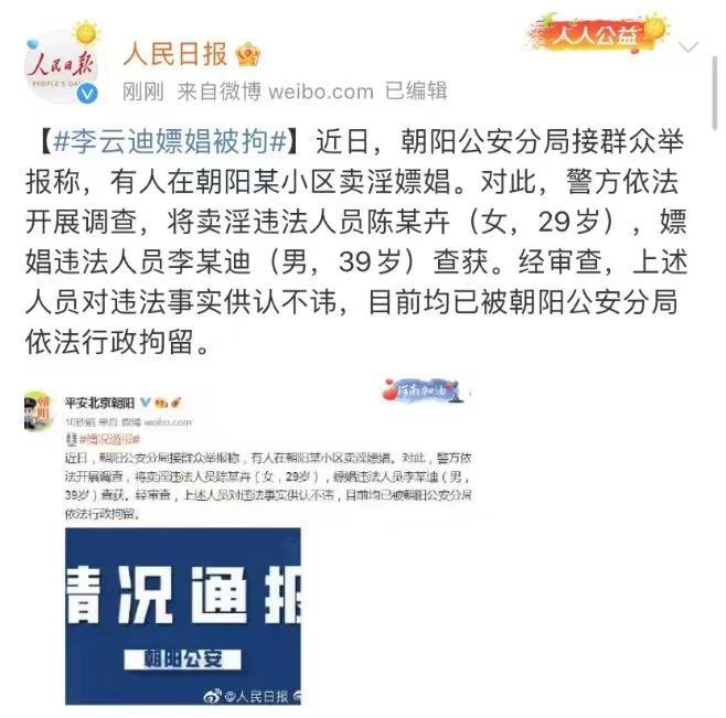 10月21日晚,北京市公安局朝阳分局官方微博发文,“近日,朝阳公安分局接群众举报称,有人在朝阳某小区卖淫嫖娼。对此,警方依法开展调查,将卖淫违法人员陈某卉(女,29岁),嫖娼违法人员李某迪(男,39岁)查获。经审查,上述人员对违法事实供认不讳,目前均已被朝阳公安分局依法行政拘留。