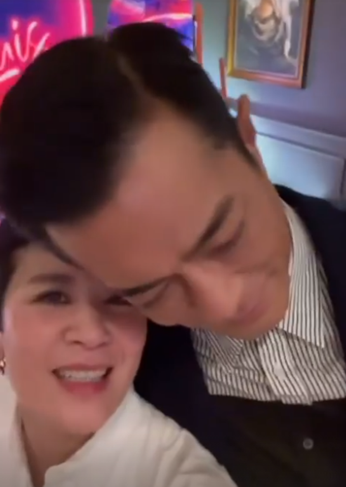 合影时,古天乐紧紧地搂着吴君如的肩膀,并与对方脸贴着脸,互动相当亲密,完全不避嫌。