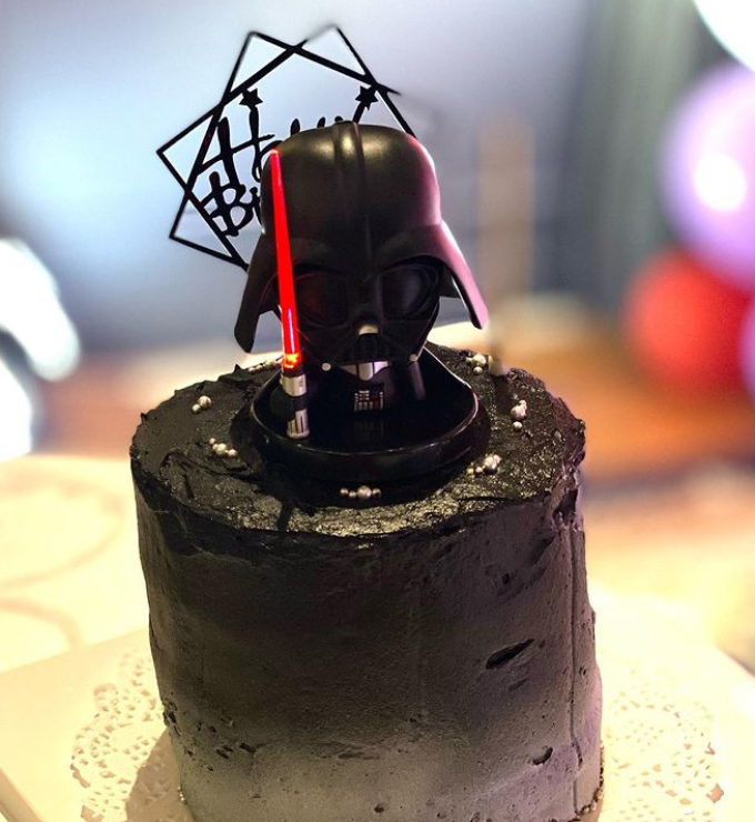 桌子上的黑色蛋糕是余安安亲手为古天乐制作的,仔细观察,蛋糕做成了《星球大战》角色“黑武士”的形状,这个角色是古天乐的最爱,余安安实在太有心思了,难怪古天乐那么开心,忍不住嘴角上扬。