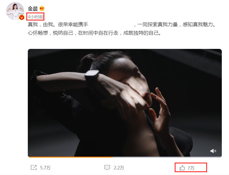 10月21日,金晨在个人社交账号中更新了一条动态,晒出了一段时间长度为45秒的视频,从金晨晒视频时的配文来看,这是金晨为新代言拍摄的广告视频,虽然这是一段广告视频,但是还是引起了不少网友的关注,4个小时的时间,点赞数就超过了7万。