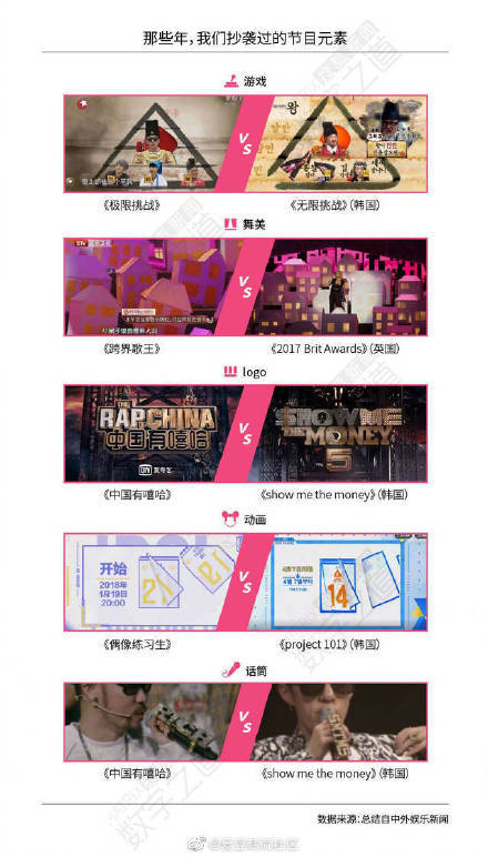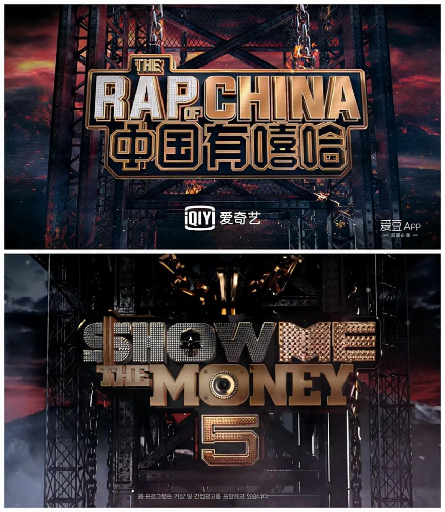 例如《中国有嘻哈》,题材、环节、logo都和韩国的《Show me the money》一模一样。