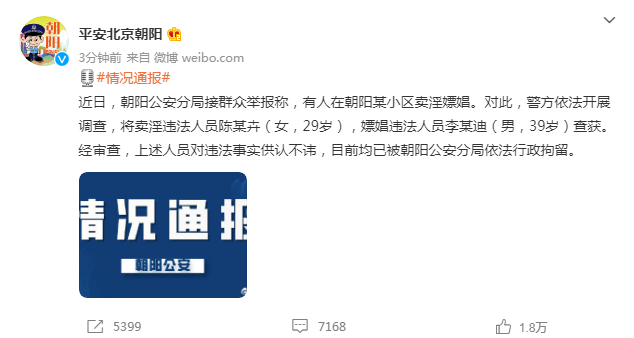 据北京警方通报,朝阳公安分局接群众举报称,有人在朝阳某小区卖淫嫖娼。警方开展调查,将卖淫违法人员陈某卉(女,29岁),嫖娼违法人员李某迪(男,39岁)查获。经审查,上述人员对违法事实供认不讳,目前均已被朝阳公安分局行政拘留。