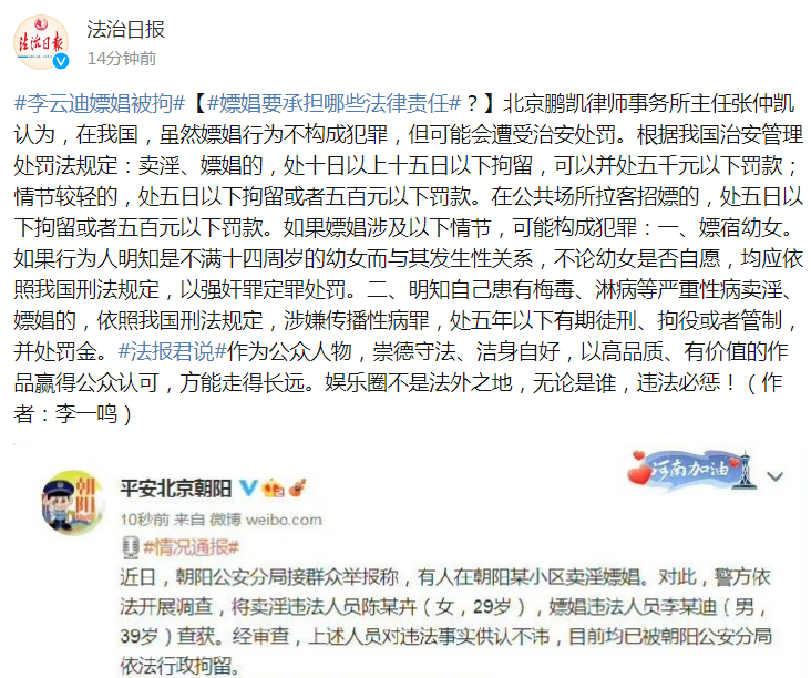 据法治日报官方微博,北京鹏凯律师事务所主任张仲凯认为,在我国,虽然嫖娼行为不构成犯罪,但可能会遭受治安处罚。根据我国治安管理处罚法规定:卖淫、嫖娼的,处十日以上十五日以下拘留,可以并处五千元以下罚款;情节较轻的,处五日以下拘留或者五百元以下罚款。在公共场所拉客招嫖的,处五日以下拘留或者五百元以下罚款。如果嫖娼涉及以下情节,可能构成犯罪:一、嫖宿幼女。如果行为人明知是不满十四周岁的幼女而与其发生性关系,不论幼女是否自愿,均应依照我国刑法规定,以强奸罪定罪处罚。二、明知自己患有梅毒、淋病等严重性病卖淫、嫖娼的,依照我国刑法规定,涉嫌传播性病罪,处五年以下有期徒刑、拘役或者管制,并处罚金。作为公众人物,崇德守法、洁身自好,以高品质、有价值的作品赢得公众认可,方能走得长远。娱乐圈不是法外之地,无论是谁,违法必惩!