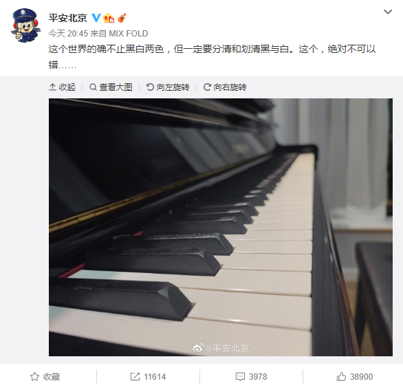 好在“平安北京”和“平安北京朝阳”不负众望,没有让悬念保持太久。21日晚9时前后,先是“平安北京”发微博:“这个世界的确不止黑白两色,但一定要分清和划清黑与白。这个,绝对不可以错……”文字与配图很有“内涵”;再是“平安北京朝阳”直来直往,干脆利落地开始“情况通报”:“近日,朝阳公安分局接群众举报称,有人在朝阳某小区卖淫嫖娼。对此,警方依法开展调查,将卖淫违法人员陈某卉(女,29岁),嫖娼违法人员李某迪(男,39岁)查获。经审查,上述人员对违法事实供认不讳,目前均已被朝阳公安分局依法行政拘留。”