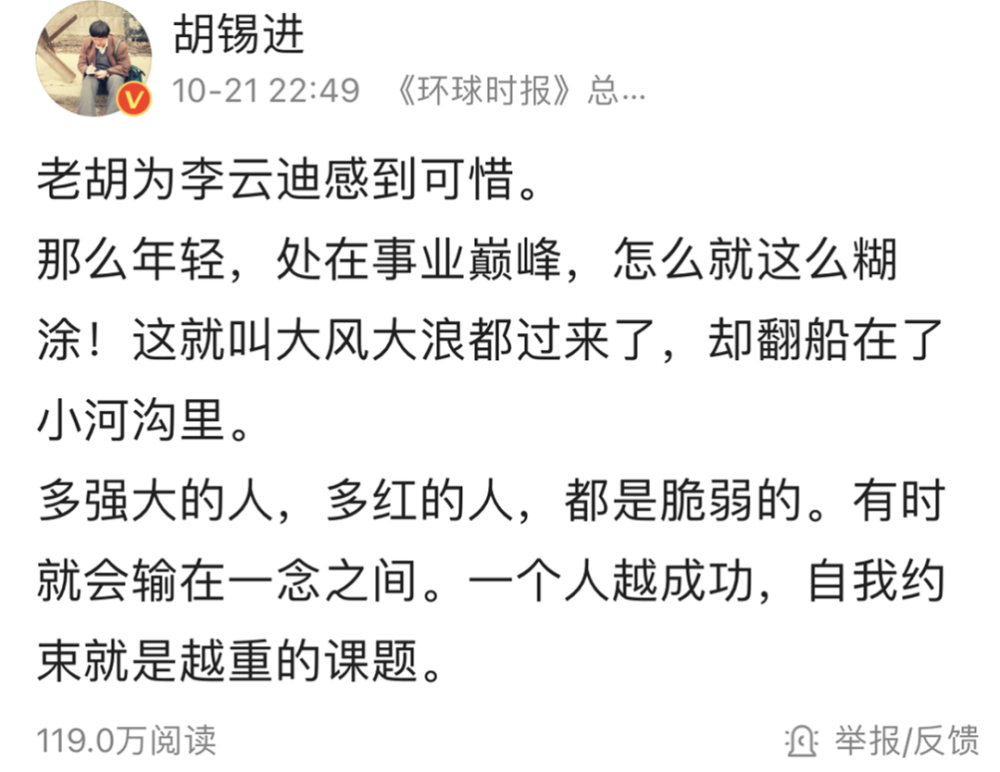《环球时报》总编辑胡锡进,就李云迪的事情发表看法,文字中充满了不解与无语。他为李云迪的糊涂感到无奈,但也不得不接受事实。