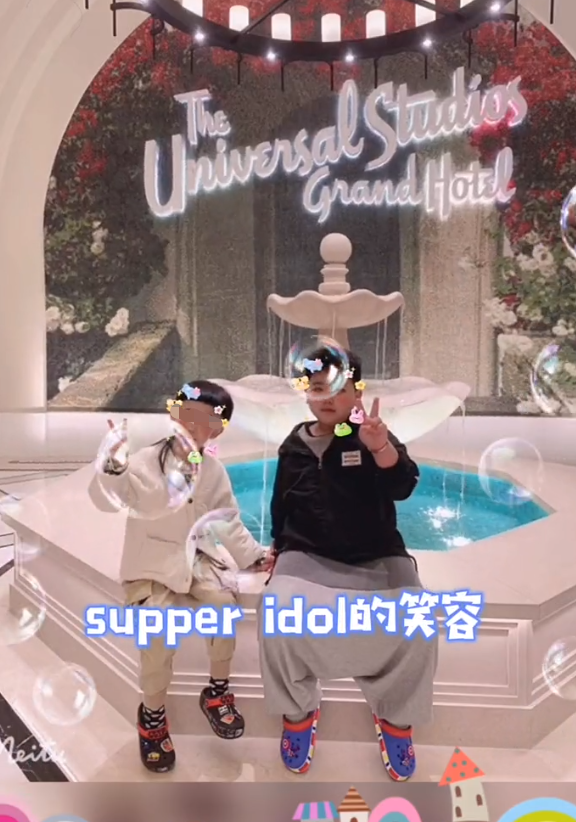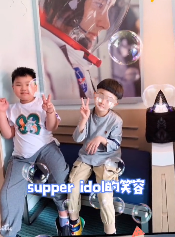 也许是在游乐场里玩热了,郭汾瑒脱掉了外套,只留下一件白色T恤。坐在凳子的郭汾瑒肚子圆滚滚,与旁边的小伙伴相比就显得圆润不少。