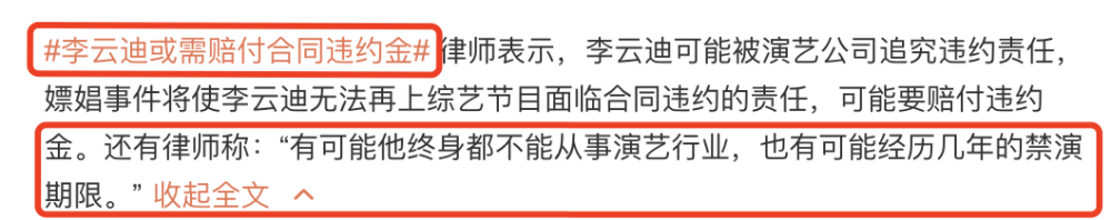 还有律师称李云迪无法再上综艺节目,可能需要赔付违约金。